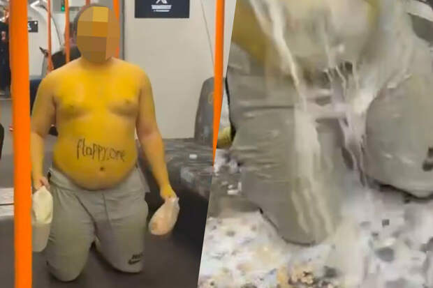 Голый по пояс пассажир метро, с выкрашенным в желтый цвет торсом и клювом на резинке встал в проходе вагона и вылил на себя содержимое бутылки — смесь молока и кукурузных хлопьев.