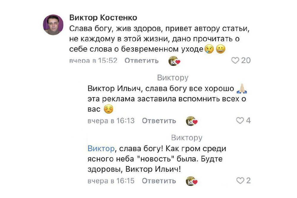 Омский художественный музей "Либеров-центр" опубликовал некролог о скульпторе Викторе Костенко, который в комментариях опроверг свою смерть. Об этом пишет kp.ru. Как уточняет газета, инцидент произошел накануне. "Ушел из жизни известный омский скульптор Виктор Костенко. Художнику было 74 года.