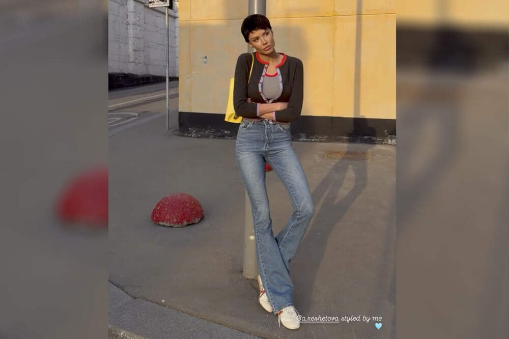 Модель Решетова с короткой стрижкой снялась в облегающих джинсах-клеш