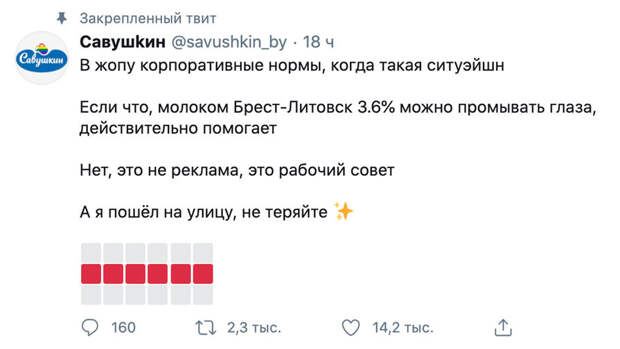 "В жопу корпоративные нормы, когда такая ситуэйшн. Если что, молоком Брест-Литовск 3.6% можно промывать глаза, действительно помогает. Нет, это не реклама, это рабочий совет. А я пошел на улицу, не теряйте", - написал он.