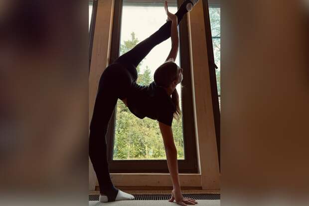 Спортсменка показала гимнастический элемент, подняв заднюю ногу на фоне живописного пейзажа за окном.