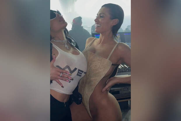На днях Бьянку Цензори и Канье Уэста засняли у кинотеатра. Модель вышла на публику в прозрачном топе, который дополнила молочными микро-шортами, бежевой кепкой и черными босоножками на каблуках. При этом жена рэпера не стала надевать бюстгальтер. Канье Уэст предпочел черное худи, треники, тапки и солнцезащитные очки.