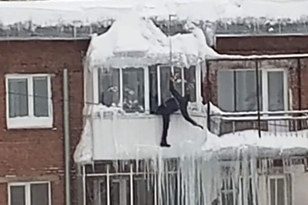 Во втором видео мужчина не свешивается из окна, а сбивает сосульки с крыши балкона.