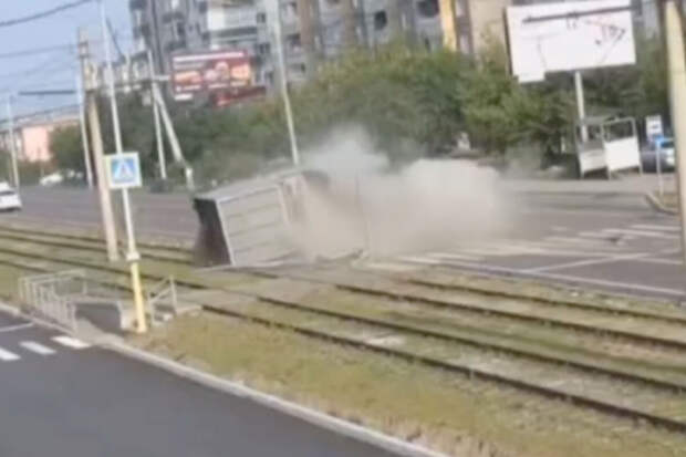 Инцидент произошел на улице Ключевой. На кадрах заметно, как грузовик врезается в легковой автомобиль, после чего падает на рельсы и песок из кузова высыпается на дорогу. В аварии никто не пострадал.