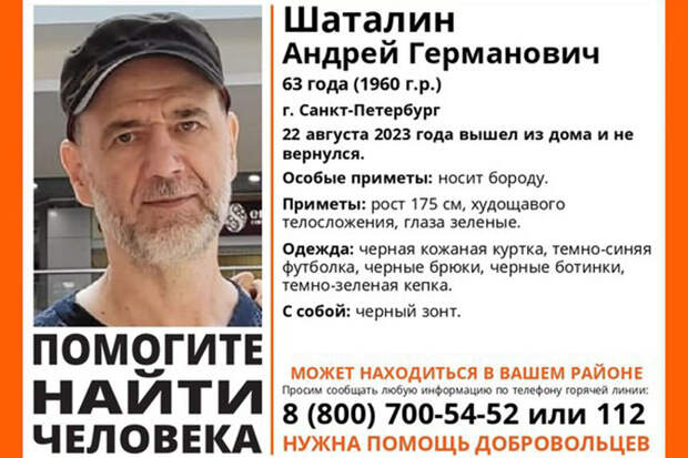 Найден добровольцами отряда ЛизаАлерт", - сказала она.Ранее в сообществе поискового отряда "ЛизаАлерт" Питер" было опубликовано сообщение о пропаже Андрея Шаталина в Санкт-Петербурге. Отмечалось, что 63-летний Шаталин ушел из дома 22 августа и не вернулся. Он был одет в черную кожаную куртку, темно-синюю футболку, темно-зеленую кепку, а также в черные брюки и ботинки. С собой у него был темный зонт.