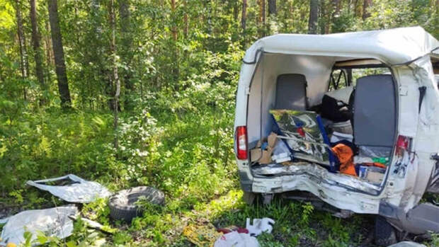 В аварии пострадали водитель и двое пассажиров, находившиеся в автомобиле медицинской службы. Они доставлены в больницу. Для эвакуации фургона потребуется длинный трос, так как машина после удара практически заехал в лес.