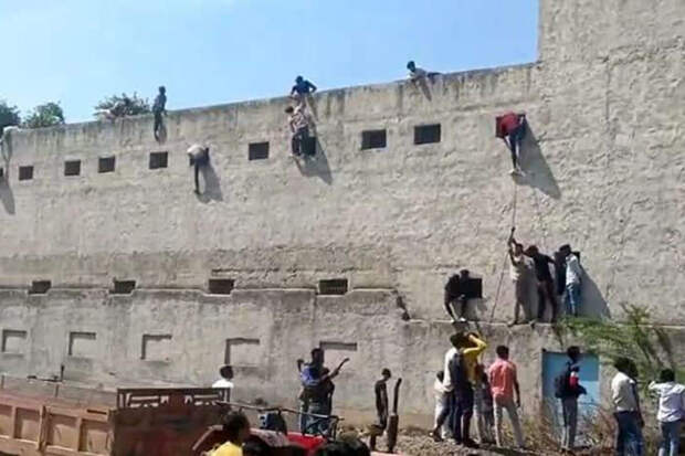 В Индии родители выпускников забрались на стену школы, чтобы помочь детям списать на экзамене, пишет Oddity Central.