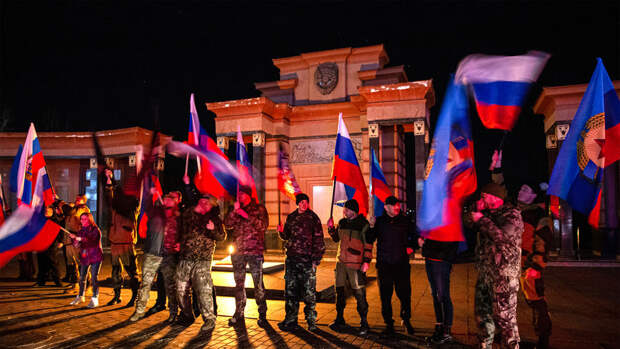Этой ночью в Луганске и Донецке были слышны канонада и взрывы: небо над городами осветил праздничный салют, улицы затуманил дым от фейерверков. А в Луганске даже устроили ночной автопробег в честь признания независимости ЛНР Россией.