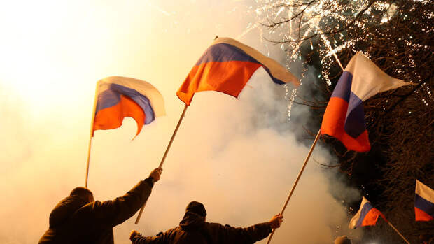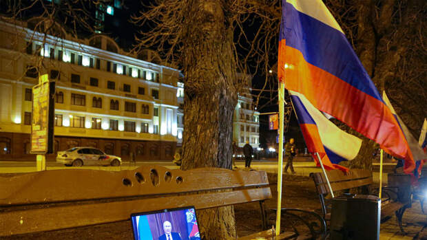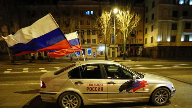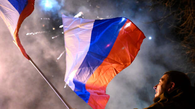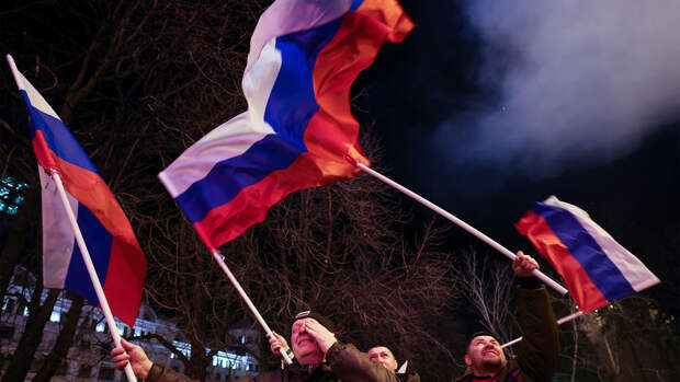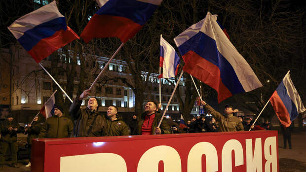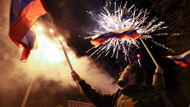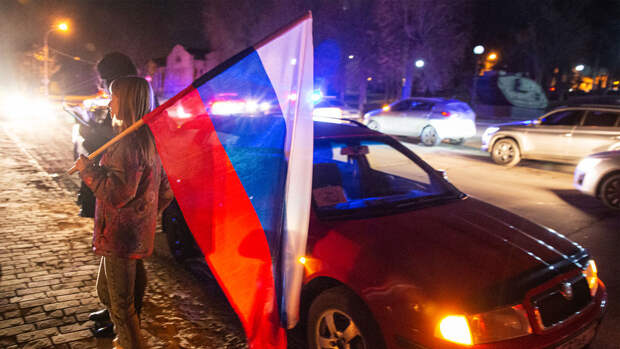 Жители республик вышли на улицы, чтобы отметить новый статус своих стран. Многие люди размахивали российским флагом, кричали "Россия" и громко слушали песни на русском языке.