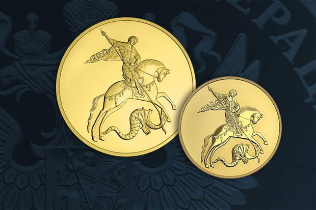 Золотая монета "Георгий Победоносец" (диаметр 22,6 мм, масса чистого золота 7,78 г, проба 999) имеет на аверсе изображение государственного герба РФ, а на реверсе – традиционное изображение Георгия Победоносца, поражающего копьем змея.
