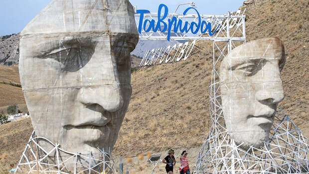 "Крым, Россия. Гости посещают 5-й фестиваль "Таврида-АРТ" недалеко от города Судак", - гласит комментарий The Guardian к фото.