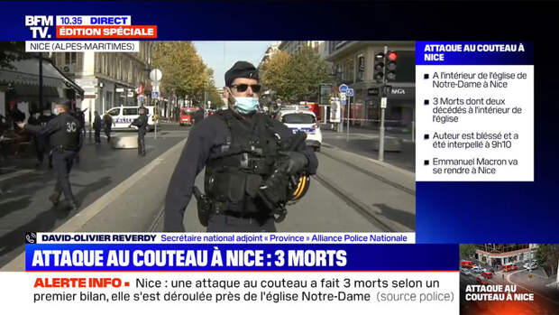 Мэр города Кристиан Кристиан Эстрози назвал атаку террористическим актом. Он также сообщил журналистам, что нападавший продолжал кричать "Аллаху акбар" ("Аллах велик" - прим. "Газеты.Ru") даже после задержания, передает Reuters. Эстрози также связал атаку с убийством учителя Самюэля Пати в пригороде Парижа Конфлан-Сент-Онорин, которое произошло 16 октября. Преподаватель местного колледжа был обезглавлен 18-летним выходцем из Чечни Абдуллахом Анзоровым, имевшем во Франции статус беженца. В своем последнем посте в соцсетях он обвинил учителя в оскорблении пророка Мухаммеда, при задержании Анзоров был убит.