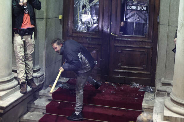 В материале указано, что в митинге принимают участие сторонники оппозиционного блока "Сербия против насилия". К текущему моменту они окружили здание скупщины (представительного органа и администрации) и поднялись на ступени.