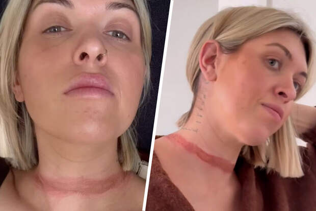 "Платье, которое держало меня в тисках", — написала она на экране, а затем, переходя к фотографиям травмы шеи, добавила: "В буквальном смысле". На снимках отчетливо виден толстый красный ожог, опоясывающий всю шею.