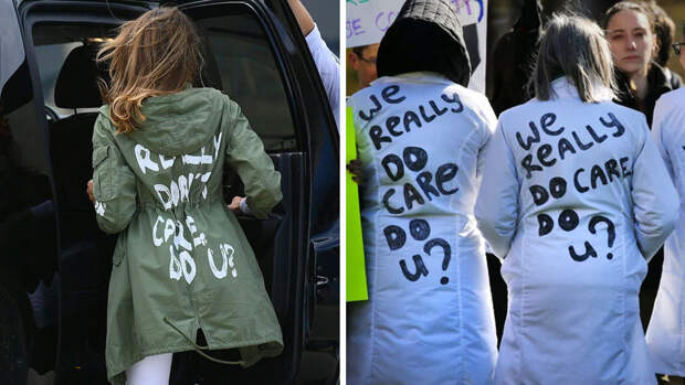 На одной из участниц забастовки папарацци заметили отсылку к неудачному наряду Меланьи. На спине медицинского халата протестующей было написано: "Нам действительно все равно?"