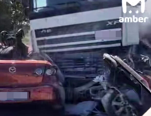 На кадрах с места аварии видно, что седан Mazda 3 оказался под кабиной большегрузной фуры с правой стороны. Еще один легковой автомобиль застрял между фурой и отбойником, от него поднимается дым. Еще один автомобиль перевернулся.