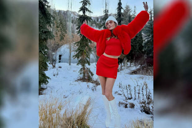 Алессандра Амбросио предстала перед камерой в красном топе, который дополнила трикотажной мини-юбкой в тон и укороченной шубой. Модель добавила к образу белую шапку, очки и высокие кожаные сапоги на каблуках.