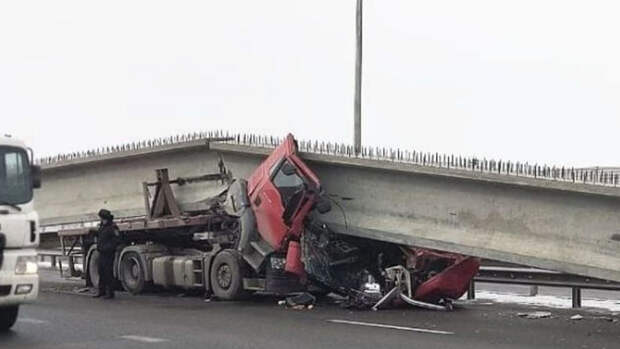 На трассе М-4 "Дон" большая бетонная мостовая балка расплющила кабину грузовика марки MAN, рассказали в пресс-службе ГИБДД Ростовской области и опубликовали снимки с места ДТП.