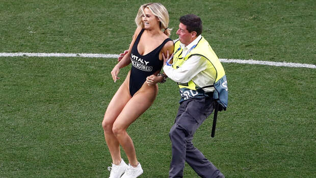 Девушка-стрикер выбежала на газон "Ванда Метрополитано" в откровенном купальнике и белых кроссовках, добежала до центрального круга, попозировала перед камерами и после этого сдалась стюардам.