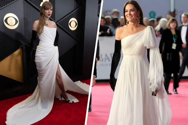 Наряд артистки напомнил журналистам культовый образ принцессы Кейт Миддлтон, в котором она позировала фотографам на премии BAFTA в прошлом году.Супруга принца Уильяма появилась на публике в белом платье-макси Alexander McQueen и черных оперных перчатках. Принцесса также надела золотые серьги.