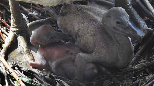 Птенцы родились с разницей всего в пять дней, однако их внешность пока сильно отличается. Один из них весит больше и уже начал опушаться.