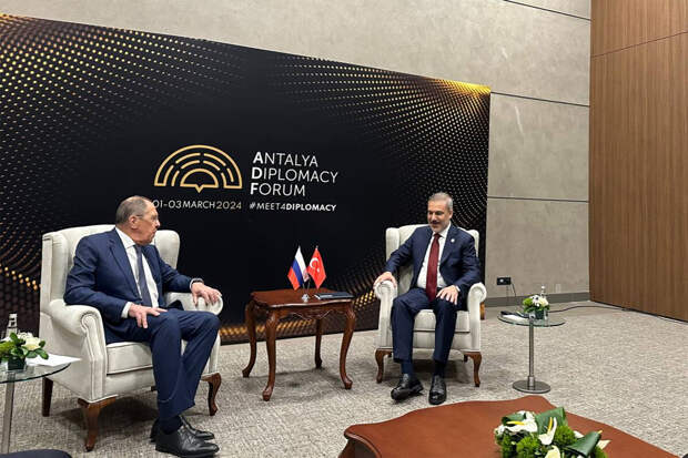 Министр иностранных дел России Сергей Лавров проводит переговоры с главой МИД Турции Хаканом Фиданом на полях Антальского дипломатического форума. Об этом сообщила официальный представитель МИД РФ Мария Захарова в своем Telegram-канале.