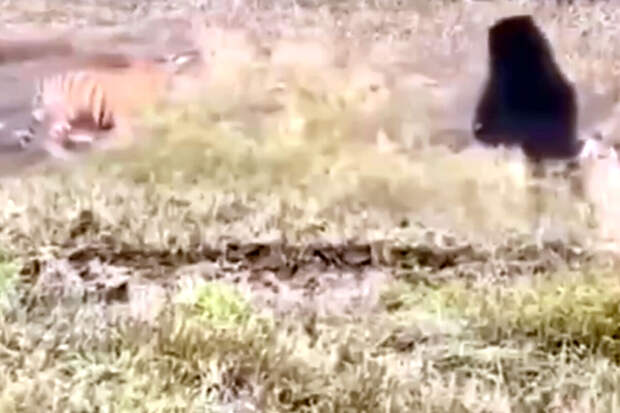 На кадрах, снятых скрытой камерой, видно, как затаившийся в кустах медведь выпрыгивает к тигру из кустов, вставая на задние лапы, после чего тигр убегает.