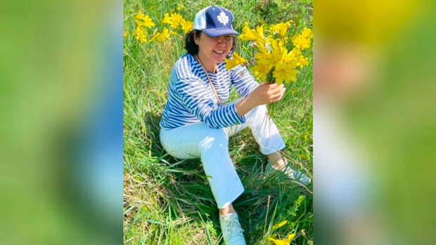 На снимке Ванчиковская сидит на земле, а в руках держит красоднев малый и лилию Даурскую.