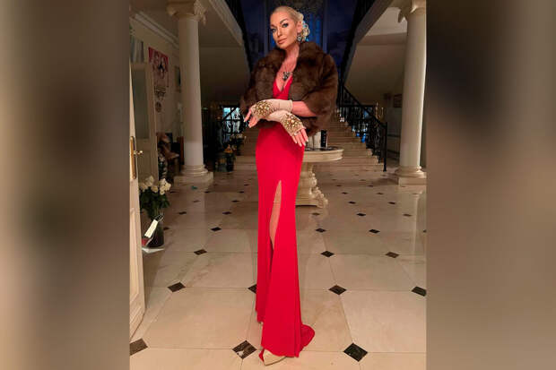 В кадре 48-летняя Анастасия Волочкова предстала в красном облегающем платье-макси с декольте и разрезом до бедра. Бывшая прима также надела полушубок и бежевые туфли на каблуках. Знаменитость дополнила наряд телесными чулками, серьгами, цепочкой с массивным кулоном и митенками.