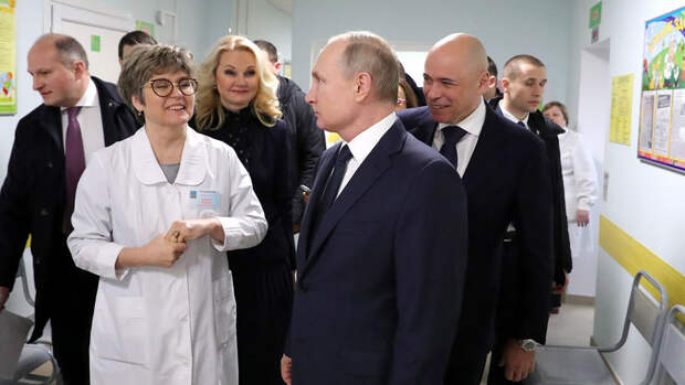 В поликлинике, которую построили в августе прошлого года, президенту рассказали о работе регистратуры. Главврач, сопровождавшая Путина, показала ему работу системы электронной записи к врачу.