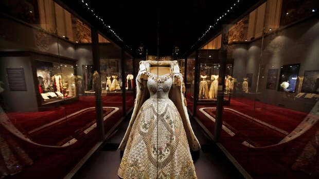 В 1953 году Ее Величество прибыла на церемонию именно в этом платье, расшитом тысячами жемчужин, блесток и кристаллов.На обозрение была выставлена и 6-метровая мантия, изготовленная королевскими мастерами ателье Ede & Ravenscroft из английского пурпурного шелкового бархата. Для ее пошива была задействована команда из 12 швей, использовавших 18 видов золотых нитей. Им потребовалось 3,5 тыс. часов, чтобы нанести на ткань инициалы королевы и изображение пшеничных колосьев и оливковых ветвей, символизирующих процветание и мир.