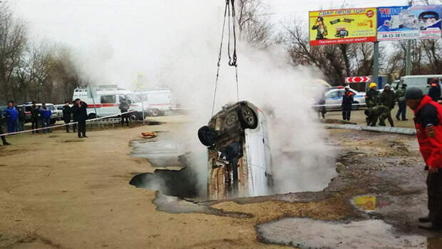 На видео машина съезжает в яму на стоянке, из которой идет густой пар.