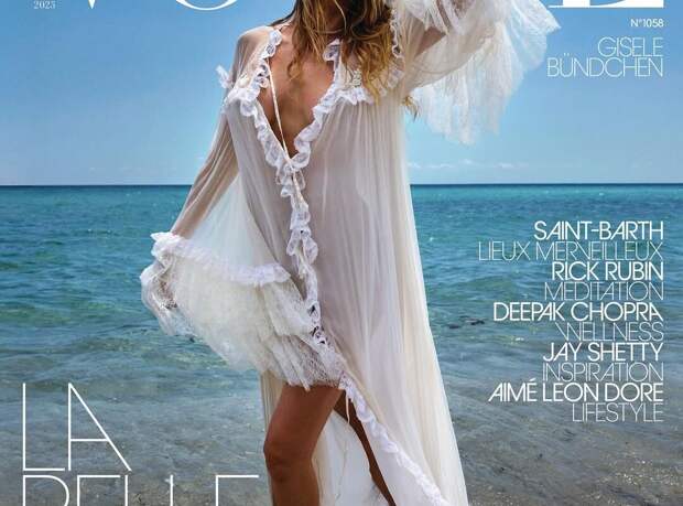 44-летняя Жизель Бюндхен стала героиней нового выпуска французского журнала Vogue. Супермодель предстала на обложке в белом абсолютно прозрачном макси-платье с глубоким декольте и разрезом, которое было украшено кружевом.
