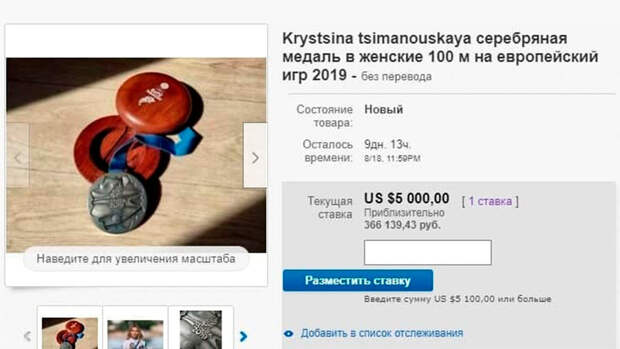 "9 августа участники аукциона готовы были заплатить за серебряную медаль Тимановской уже более $ 20 тыс.