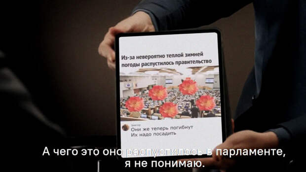 "Самая, наверное, первая появилась о том, что из-за аномально теплой погоды в России распустилось правительство", - добавил журналист, показывая Путину на планшете мем.