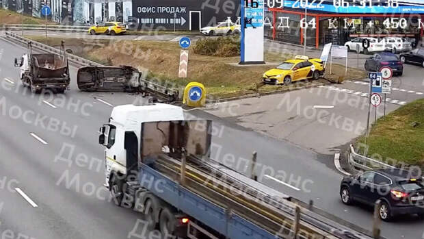 Аварию спровоцировала машина такси, которая перестроилась из соседнего ряда направо и "подрезала" легковушку, которая после столкновения перевернулась. Автомобиль такси выехал на территорию АЗС.