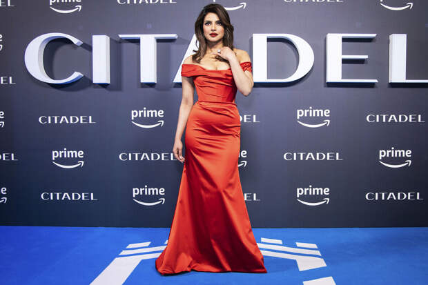 40-летняя Приянка Чопра появилась на премьере научно-фантастического сериала "Цитадель" вместе с супругом Ником Джонасом. Для вечера она выбрала алое атласное платье с глубоким декольте и корсетом.