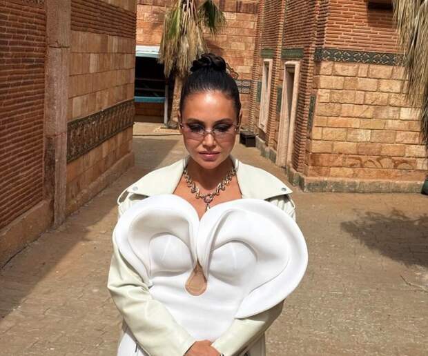 Ляйсан Утяшева позировала перед камерой в белом макси-платье с разрезом и аппликацией на лифе, которое дополнила кожаной курткой в тон. Бывшая гимнастка завершила образ очками, массивной цепью и кольцами.