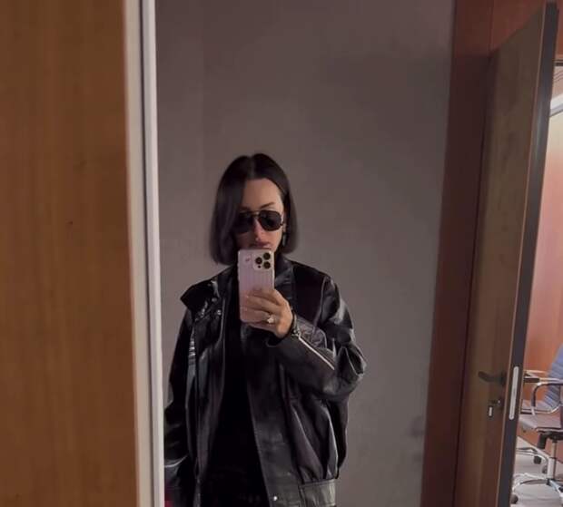 50-летняя Тина Канделаки стояла перед зеркалом в черной кожаной куртке, водолазке и мини-юбке с мехом. Телеведущая дополнила образ ботильонами на каблуках, массивными серьгами, солнцезащитными очками, кольцами и кожаной сумкой.