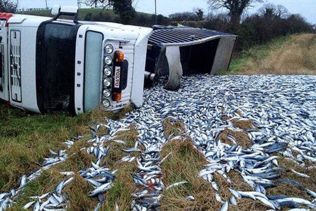 Отмечается, что водитель грузовика не заметил, как открылся кузов и выпала рыба.