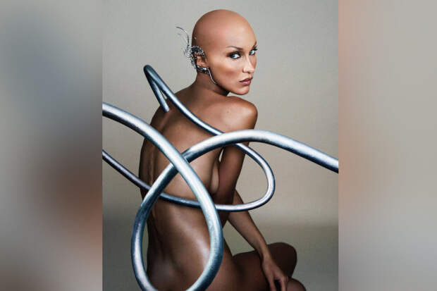 Для съемок в кампейне Белла Хадид перевоплотилась с футуристичного лысого робота, "вдохновленного искусственным интеллектом". На одном из снимков 26-летняя модель позировала в серебристом "нижнем белье", похожем на доспехи воина, а на другом запечатлена в розовом топе и джинсовой мини-юбке.
