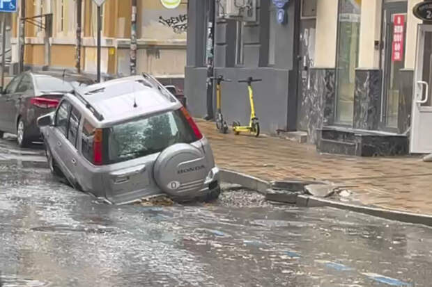 На кадрах видно, что инцидент произошел в переулке со старинной застройкой. Задняя часть серебристого кроссовера Honda CR-V оказалась под землей, ее колеса не видны над поверхностью.
