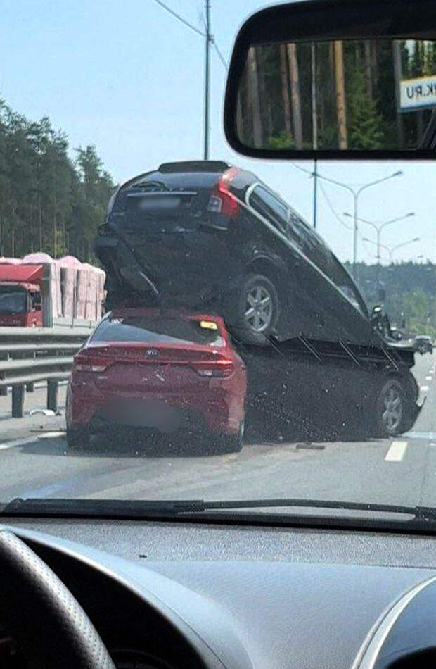 На опубликованных в сети кадрах видно, как один автомобиль приземлился на другой в момент ДТП.