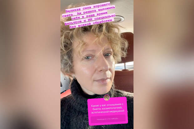 Она сидела в коричневом салоне автомобиля."Великая сила хорошего света. Аж решила выложить себя в наше время фильтров и искусственного интеллекта специально без всякой обработки", — написала Чурикова.