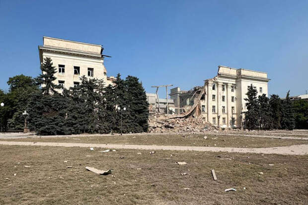 Первый удар частично разрушил здание, а также сорвал украинский флаг. Второй еще больше повредил строение. На кадрах, опубликованных в сети, видно, что больше всего пострадала центральная часть здания.