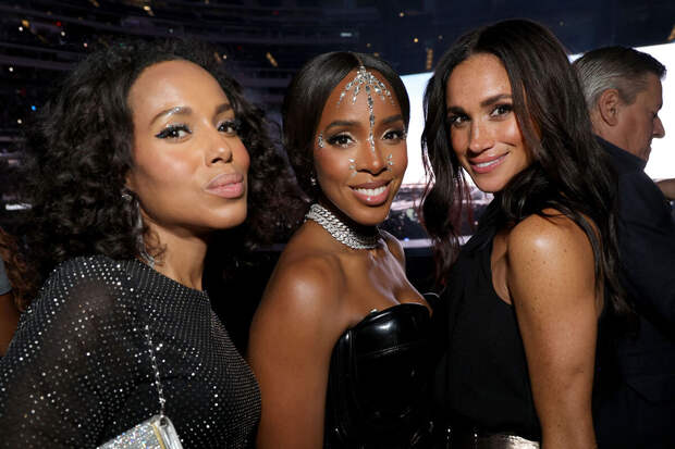 На снимке, сделанным звездным фотографом Кевином Мазуром, герцогиня Сассекская запечатлена в компании актрисы Керри Вашингтон и певицы Келли Роуленд. Меган Маркл была одета черный топ с открытыми плечами и серебристую юбку до колена.