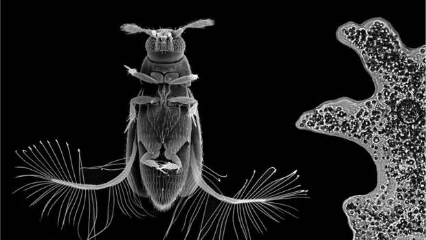 Такое преобразование крыла называется птилоптерией. Однако некоторые миниатюрные жуки летают также быстро и с тем же уровнем маневренности, как и насекомые втрое больше их. Сотрудник Биологического факультета Московского государственного университета Сергей Фарисенков и его коллеги выяснили, как им это удается.Для этого ученые помещали особей Paratuposa placentis под объективы высокоскоростных видеокамер с сильным увеличением и подсвечивали их лазером. P. placentis обычно достигают размера около полумиллиметра – размер крупной амебы.