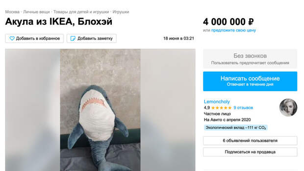 На сайте "Авито" начали появляться объявления о продаже продукции компании IKEA, которая ранее объявила о сокращении бизнеса в России. Житель Москвы Артем выставил на продажу один из самых популярных товаров компании — плюшевую акулу "Блохэй". За игрушку москвич установил цену в 4 млн руб., однако в беседе с "Газетой.