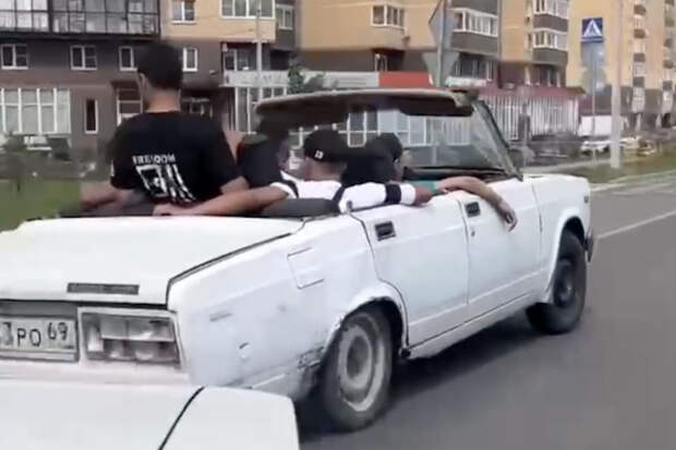На опубликованных в сети кадрах видно, как группа подростков катается на самодельной машине и выставляет напоказ игрушечное оружие.