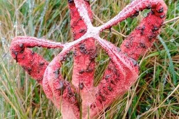 Этот причудливый гриб, официально именуемый Clathrus archeri, легко узнать по ярким красным "щупальцам", которые прорываются из яйцевидной оболочки и раскрываются, приобретая характерный розовато-красный цвет. Однако его главная особенность — сильный неприятный запах, напоминающий гниющую плоть. Источником аромата является оливково-коричневая слизь, называемая "гельба", которая привлекает насекомых для распространения спор.